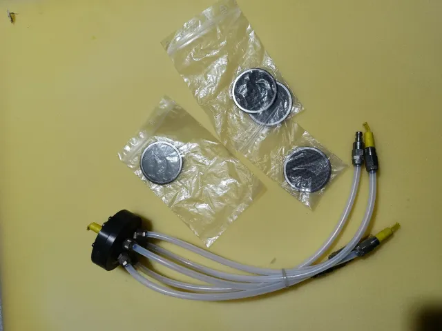 Detalles del productoConjunto de filtros para impresora Durst. Incluye varios filtros circulares con malla metálica y un cabezal distribuidor con tubos.