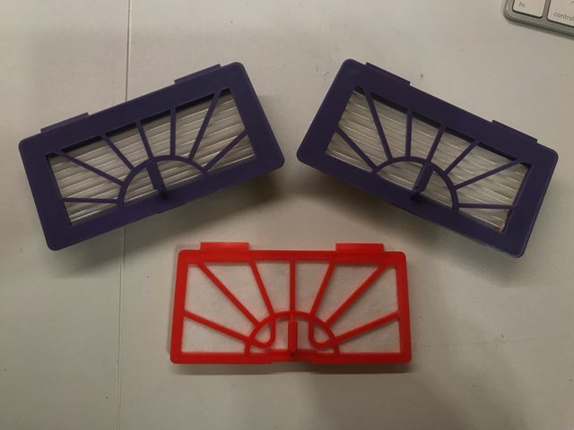 Conjunto de 3 filtros para robot aspirador Neato. - Dos filtros de color morado (mejorado) - Un filtro de color rojo (básico) - Sin usar