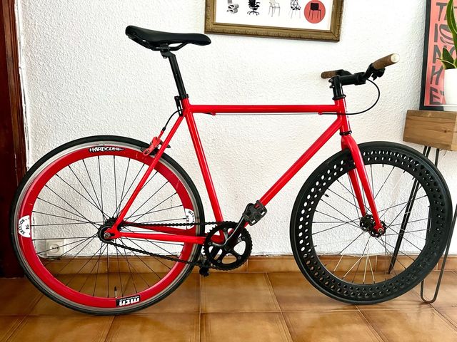 Bicicleta Fixie en color rojo, talla 56. Funciona perfecto - Doble piñón. - Ruedas de perfil rojo y negro. - Sillín negro.
