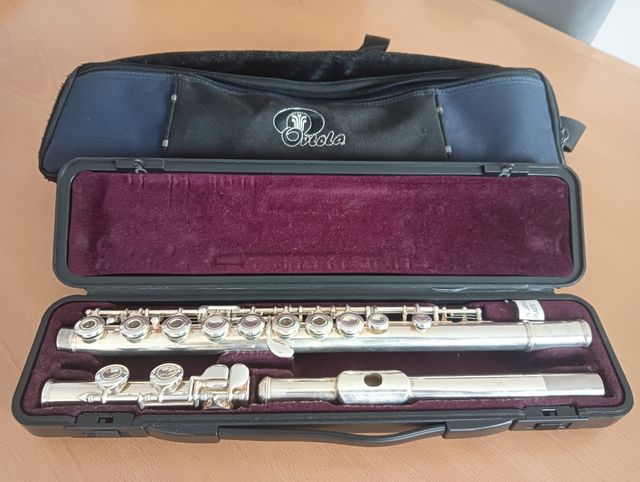 Flauta travesera en perfecto estado, casi sin uso. Incluye funda y atril. - Flauta travesera plateada. - Funda protectora. - Atril para partituras.