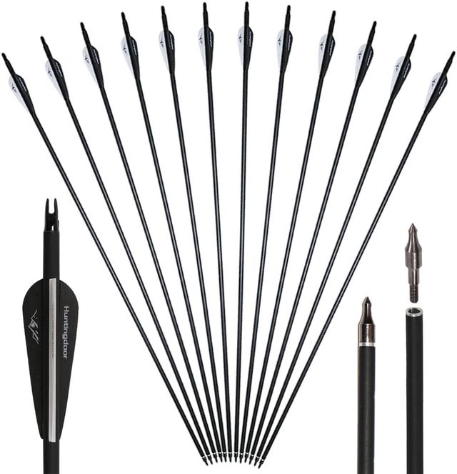 Pack de 12 flechas de carbono de 30 pulgadas. - Material: Carbono. - B07XDK5K9W - Longitud: 30 pulgadas. - Cantidad: 12 unidades.