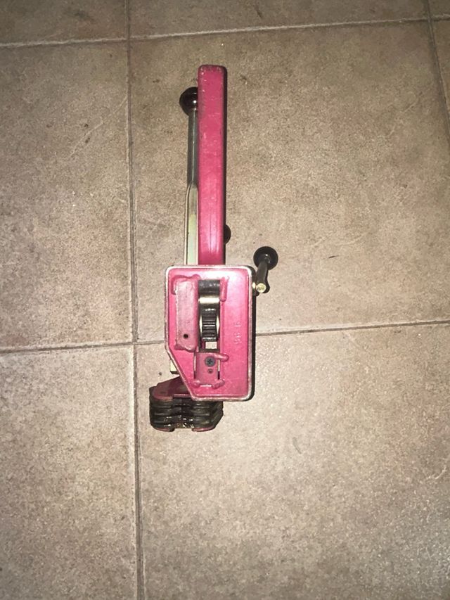 Herramienta para flejar o asegurar cargas con fleje metálico. Es robusta y fácil de usar. - Color: Rojo y plateado. - Mecanismo de trinquete.