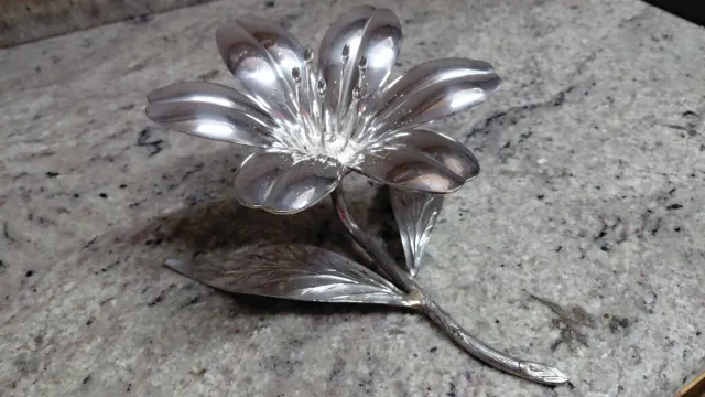 Elegante cenicero con forma de flor, acabado plateado. - Diseño detallado de pétalos. - Base con hojas. - Material metálico. Precio negociable