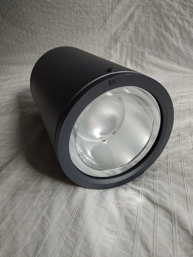 Detalles del productoLuminaria de superficie de la marca Erco, colección Zylinder, referencia 85030.000 color grafito sin estrenar. Según el catálogo del fabricante el downligth es de fundición de aluminio resistente a la corrosión, tiene una protección IP65 (protección total contra el polvo y contra chorros de agua de baja presión) por lo que se puede colocar en interior y exterior. Funciona con una bombilla QT12-ax 100w/12V GY6,35 (no incluida). Este tipo de foco se emplea para la iluminación general y de acento, así como para bañados de paredes. El proyector mide 28,1 centímetros de largo y 18 cm de diámetro. Esta sin colocar.