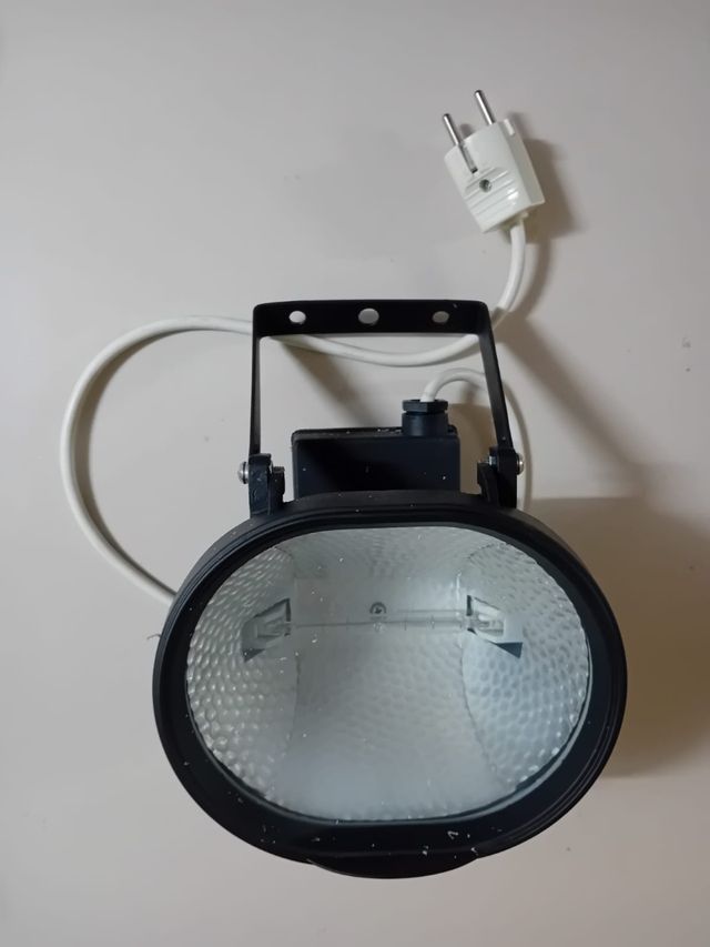 Foco halógeno con bombilla, rejilla y cable. Dos unidades. 10€ cada una.
