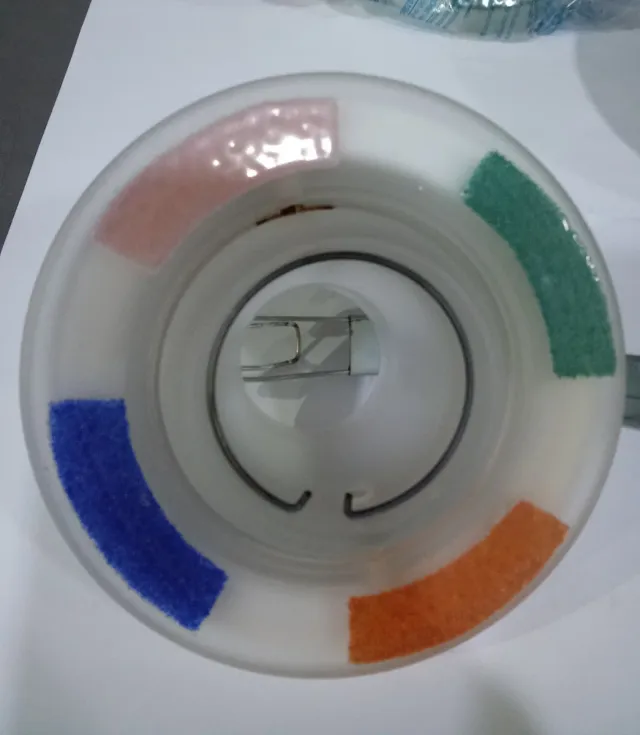 - Diseño circular de cristal transparente con almohadillas de colores.