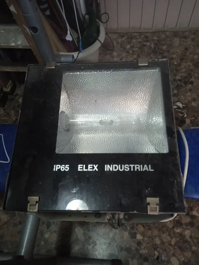 Foco industrial Elex con protección IP65. - Diseño robusto para exteriores. - Marca: Elex - Modelo: Industrial - Protección: IP65