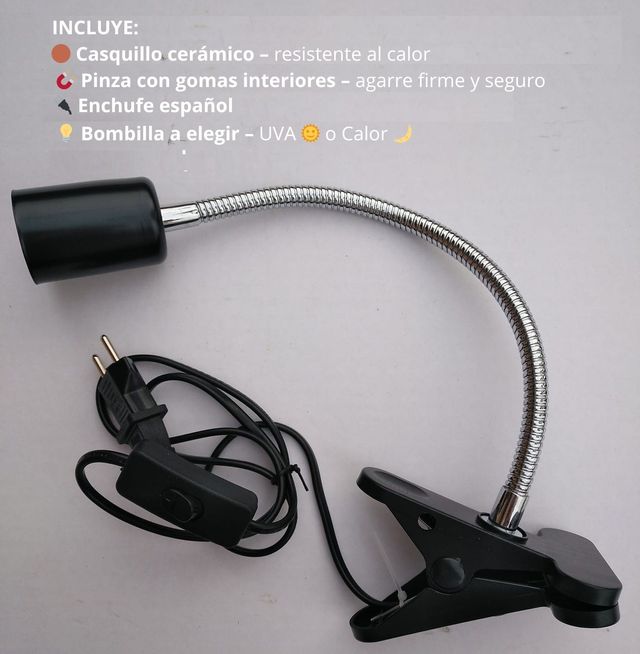 Detalles del productoLampara para reptiles con rotacion 360 grados y casquillo ceramico para todas las bombillas de rosca gorda (tipo E27), tanto las de iluminacion como las de calor. Se sujeta al borde superior del terrario/acuario con un mecanismo de pinza. Diseñado para aguantar altas temperaturas. Está nuevo en su caja precintada. Hago envios por Correos solo 3€ toda España incl. Canarias o compralo con la App Wallapop, que protege tu pago y te permite devoluciones con 100% de rembolso incl. gastos envio. Si quieres tambien una bombilla, mira mi otro anuncio de un pack lampara+ bombilla por solo 22€. Entrega gratis: Valencia y pueblos cercanos.