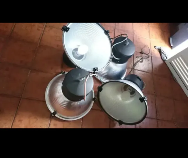Lote de dos focos reflectores industriales. - Diseño metálico plateado. - Base negra. - Incluye bombilla 250W E40