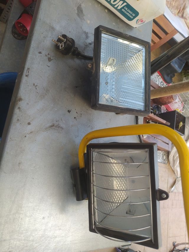 Se venden dos focos de exterior, ideales para iluminar jardines o patios. - Uno de ellos tiene un soporte amarillo. - Ambos son de metal y cristal.