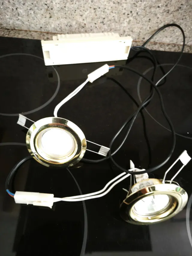 Se venden dos focos empotrables con transformador acabado dorado. Ideales para iluminación interior. - Acabado metálico dorado. - Incluye transformador.