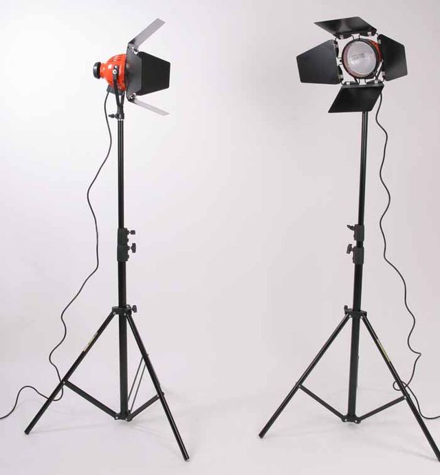 Set de 2 focos de luz contínua halógena de 800w cada uno. Mecanismo de ajuste de ángulo de iluminación, soporte de horquilla robusto, rejilla de proteccion y 4 aletas.