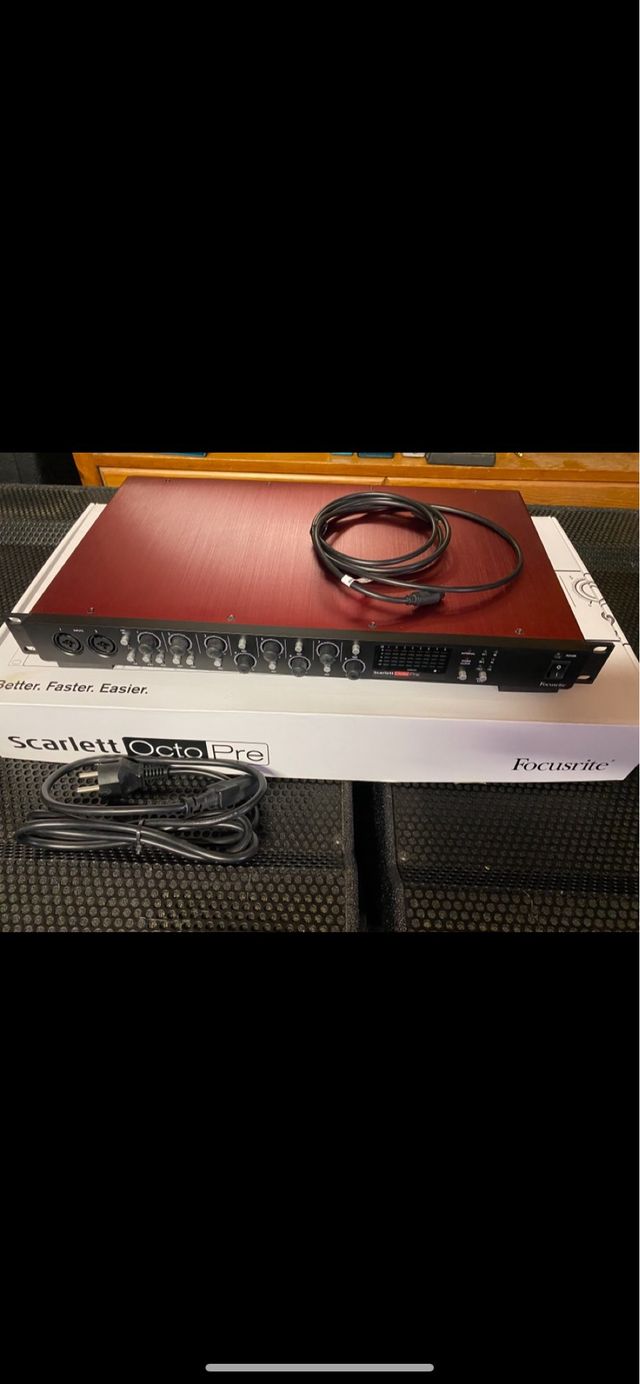 Detalles del productoPrevio de micrófono Focusrite Scarlett OctoPre con 8 canales y conexión ADAT. Ideal para expandir tu configuración de audio.