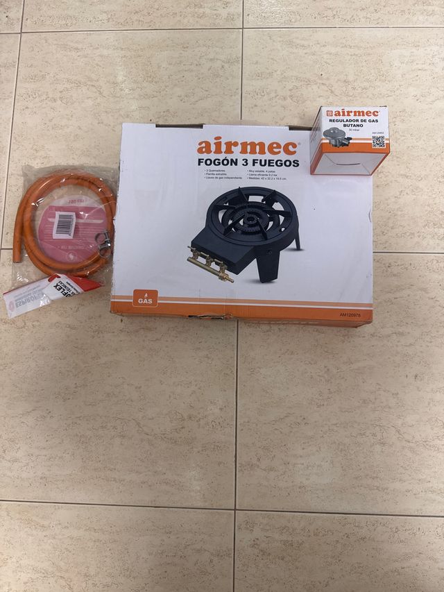 Fogon de gas Air mec con tres quemadores. Ideal para cocinar. - Tres quemadores. - Parrilla estable. - Incluye regulador de gas butano.