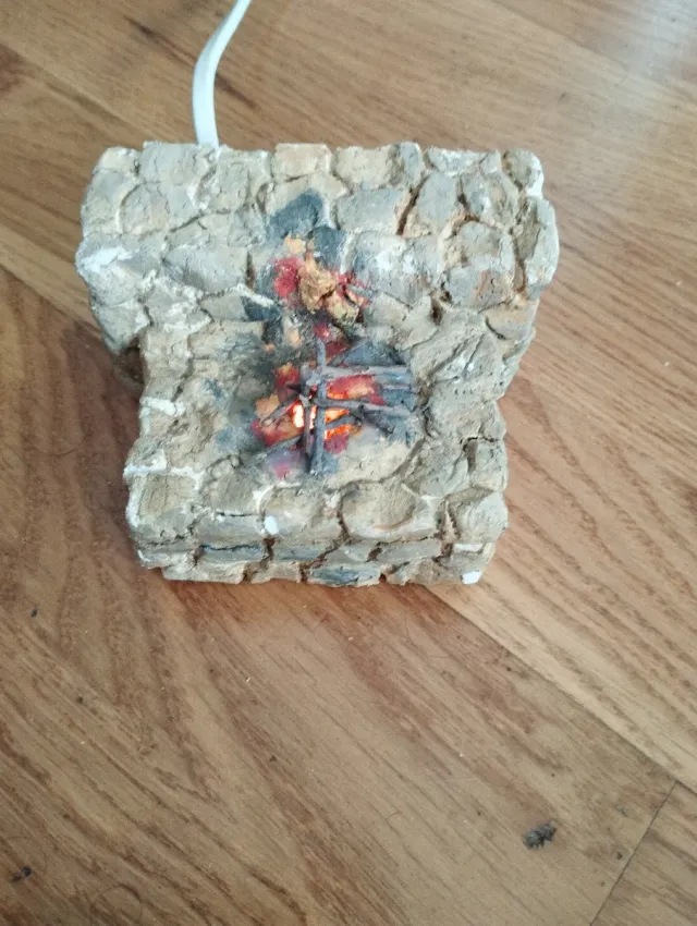 Precioso fogón artesanal para belenes. Representa un hogar rústico con detalles cuidados. - Diseño de piedra. - Efecto fuego realista.