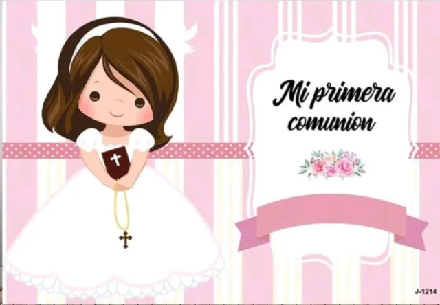 Fondo fotográfico temático para comunión. - Diseño con niña vestida de blanco. - Motivos de palomas y flores. - Frase Mi primera comunión. Medida: 210 x 150