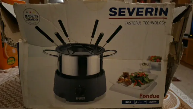 Fondue eléctrica Severin de acero inoxidable. - Potencia de 800W. - Incluye 5 tenedores. - Fabricada en Alemania.