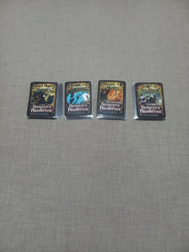 Conjunto de cuatro mazos de cartas para el juego de mesa Shadows of Brimstone. - Dead Man's Bounty - Ghosts of the Damned - Blood Money - Edge of the Abyss