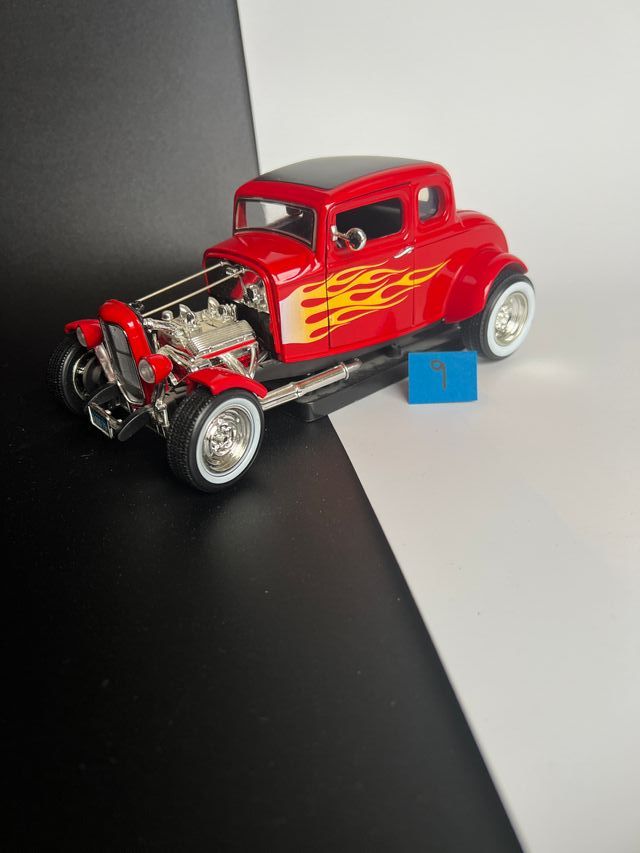 Detalles del productoRéplica detallada de un Ford Hot Rod de 1932, modelo Five Window Coupe, a escala 1/18. Este coche a escala presenta un llamativo diseño rojo con detalles de llamas amarillas.