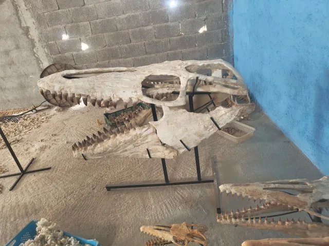 Réplica de un cráneo de dinosaurio, ideal para coleccionistas o exhibición. - Réplica detallada de un cráneo de dinosaurio. - Montado sobre soportes para exhibición.