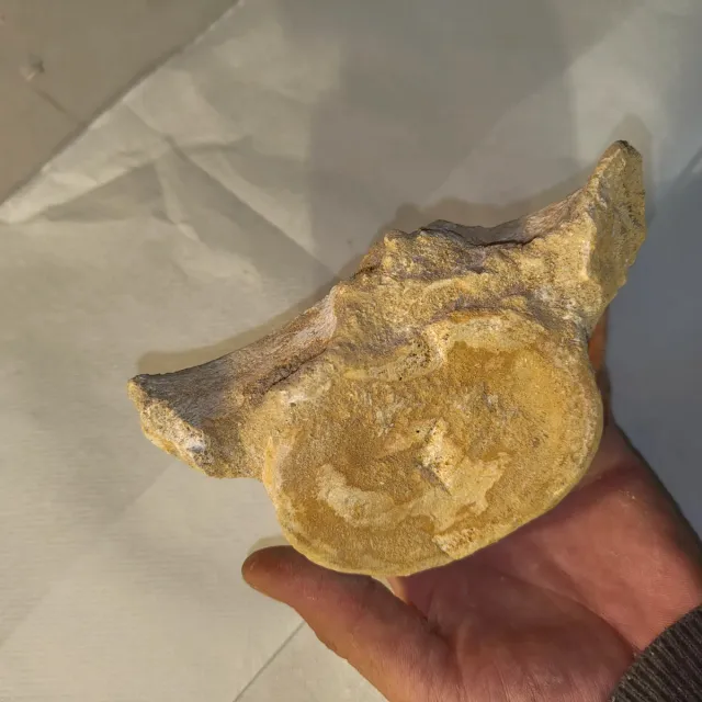 Pieza de fósil de hueso, con textura y coloración únicas. - Forma irregular. - Textura rugosa. - Coloración amarillenta y marrón.