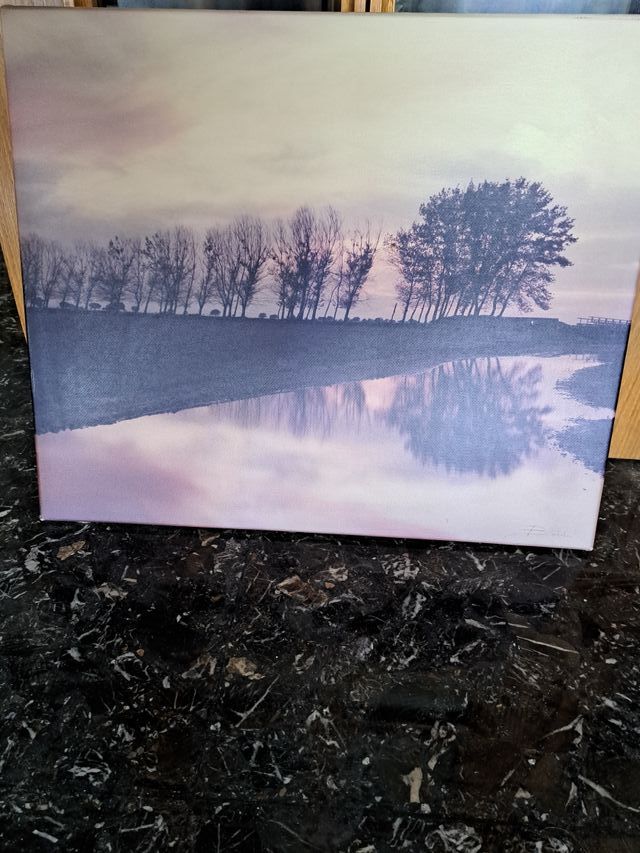 Detalles del productoFotografía profesional de paisaje del artista Jaime Belda. Captura un sereno reflejo de árboles en el agua bajo un cielo crepuscular.