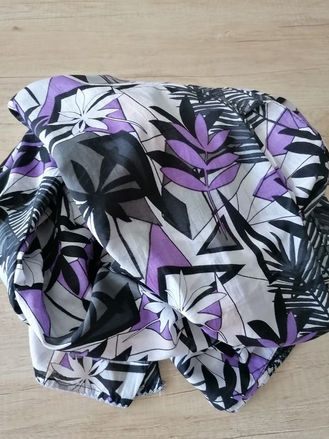Detalles del productoFoulard algodón Pieces, colores negro, blanco y morado. Detalle con hilo plateado en laterales. Medidas 248 cm largo y 98 cm ancho. El foulard está sin estrenar, nuevo con etiquetas.