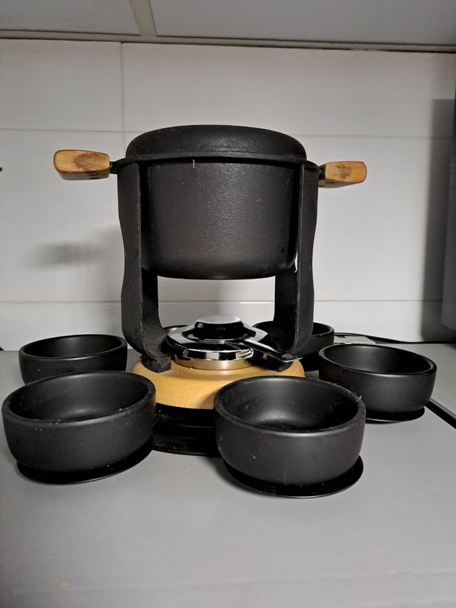 Con 6 cuencos negro de cerámica, quemador, 6 pinchos de trinchar y 6 cucharillas para salsa.