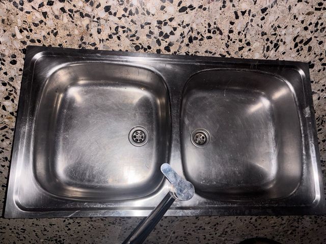 Fregadero de dos cubetas en acero inoxidable, en buen estado general. Presenta señales normales de uso (pequeños arañazos superficiales), pero es totalmente funcional. Ideal para cocina, lavadero o segunda vivienda. Fácil de limpiar y resistente.