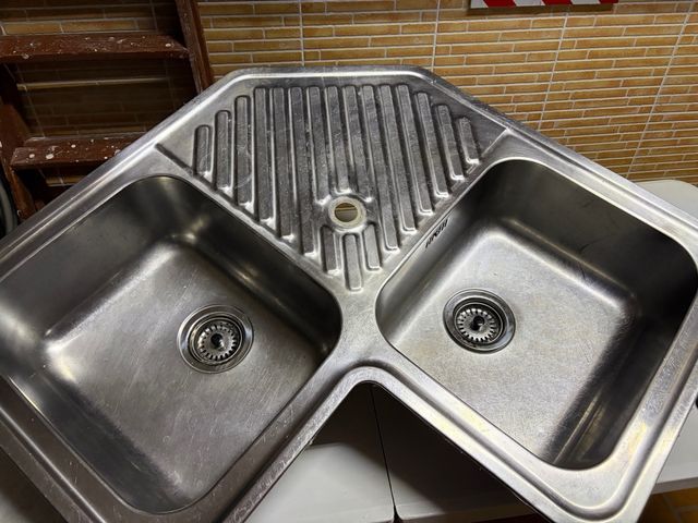 Fregadero de esquina fabricado en acero inoxidable, ideal para optimizar el espacio en tu cocina. - Diseño angular. - Dos cubetas. - Escurridor integrado.