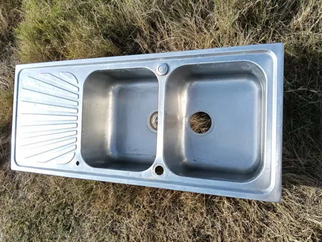 Detalles del productoFregadero de cocina de gran tamaño con dos cubetas y escurridor.