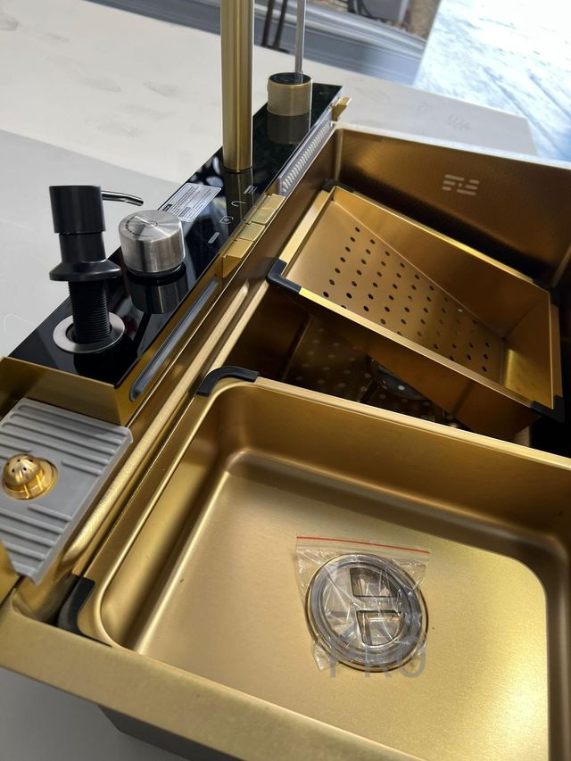 Detalles del productoFregadero dorado de acero inoxidable con pantalla LED, control de temperatura, múltiples salidas de agua y accesorios incluidos.