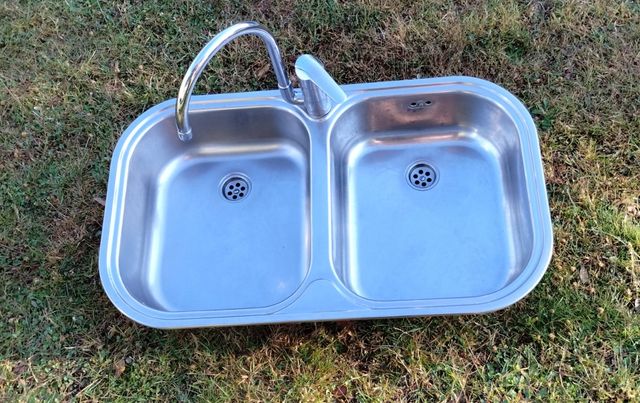 Un fregadero de dos senos de acero inoxidable, con grifo y conexión. 30 EUR Otro fregadero de un seno, con grifo Roca y escurridor. 20 EUR. Buen uso. Por reforma.