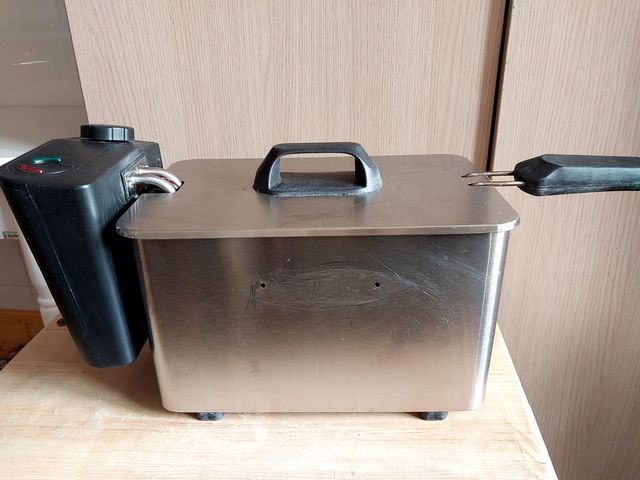 Detalles del productoFreidora de aceite en buen estado. Es de acero inoxidable y tiene un diseño compacto.