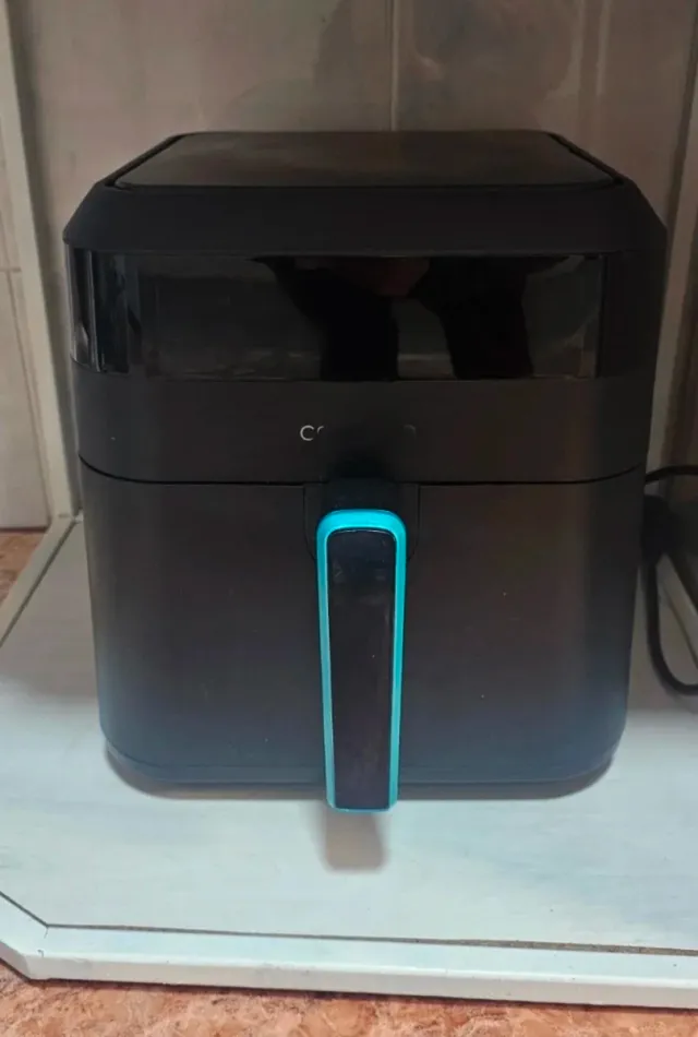 Freidora de aire Cecotec en color negro. Diseño moderno y compacto. - Asa con detalles en azul.