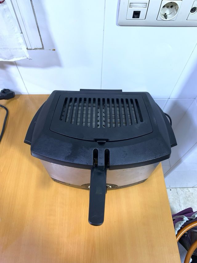 Freidora de aceite para uso doméstico. Diseño compacto y funcional. - Cuerpo de acero inoxidable. - Control de temperatura ajustable. - Tapa con filtro.