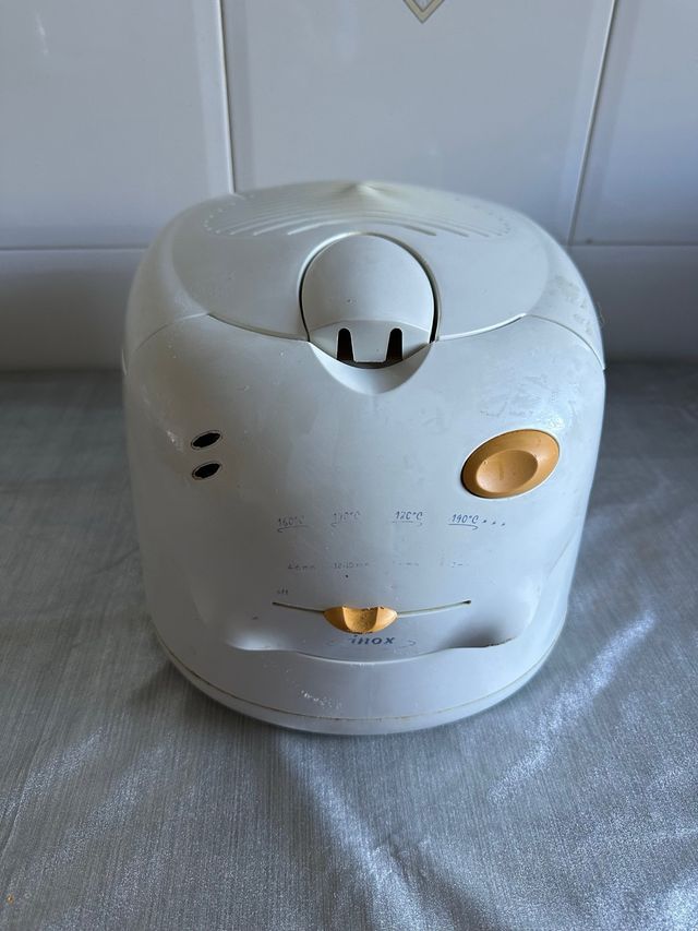 Detalles del productoFreidora de aceite de color blanco. Cuenta con un diseño compacto y práctico.