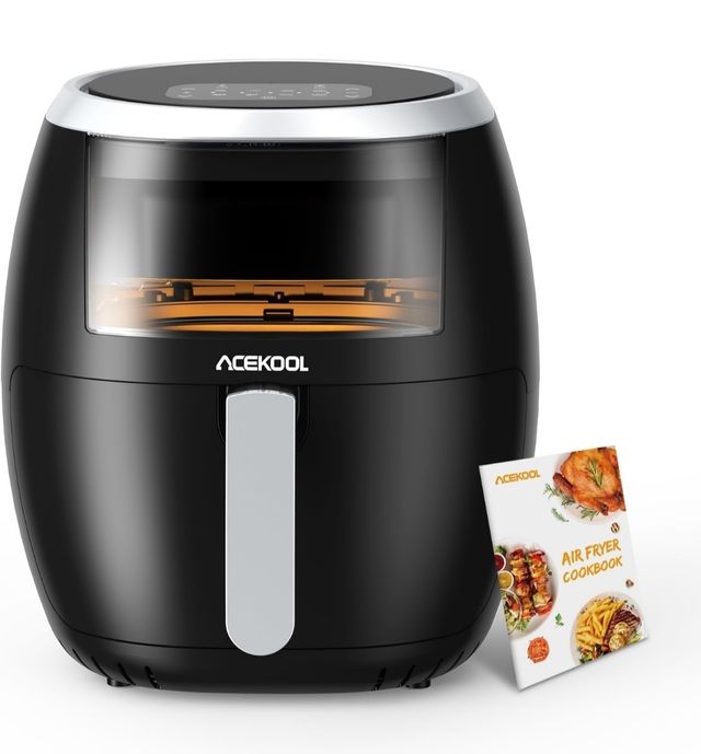 8 Programas: La freidora sin aceite está equipada con 8 programas predefinidos, incluyendo Papas fritas, Costillas, Camarones, Pastel, Muslo, Bistec, Pescado, Precalentamiento. Temporizador (1-60 min) y temperatura (80℃-200℃).