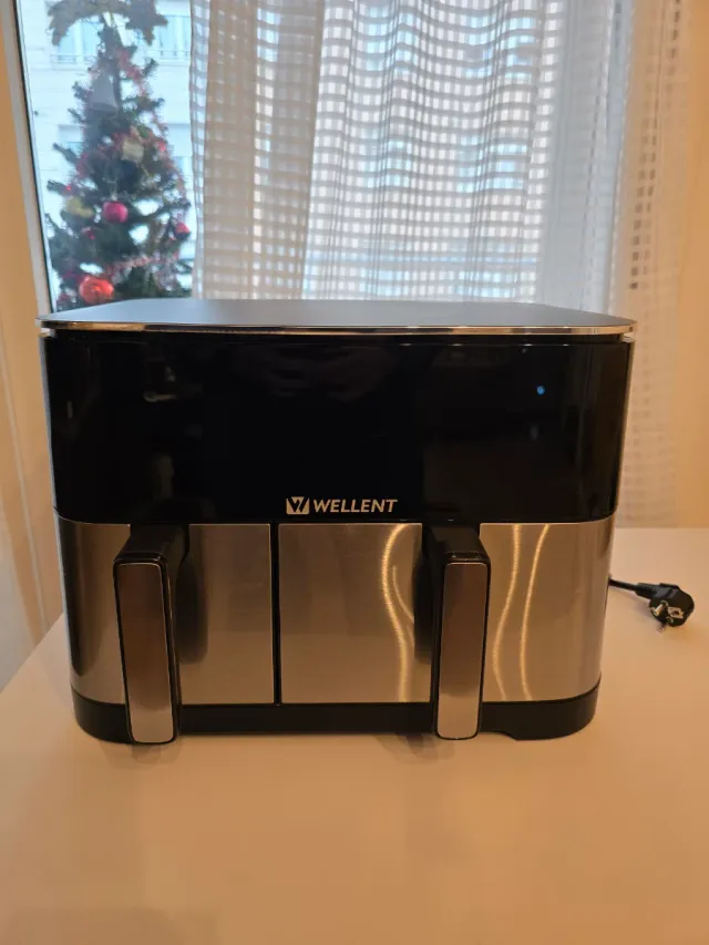 Detalles del productoFreidora de aire doble con dos cestas independientes. Diseño moderno en color negro y acero inoxidable.