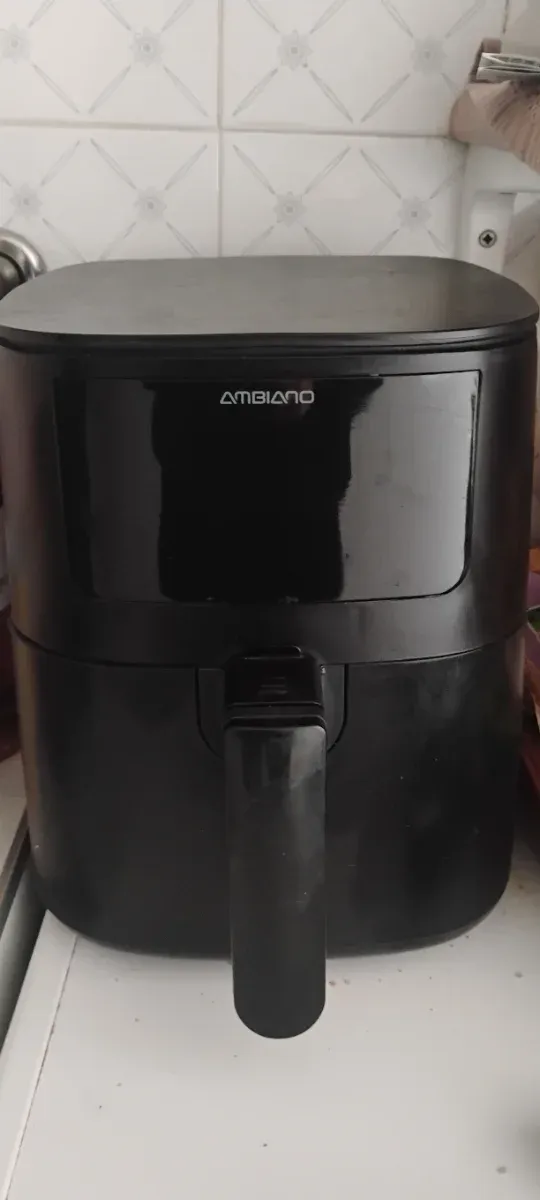 Freidora de aire de la marca AMBIANO en color negro. - Diseño moderno y compacto. - Asa frontal para fácil extracción. - Superficie brillante.