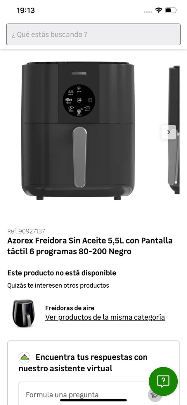 Freidora de aire Azorex con pantalla táctil. - Capacidad de 5,5 litros. - 6 programas. - Rango de temperatura de 80-200 grados. - Color negro ref W2