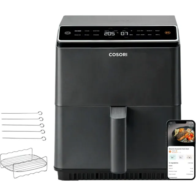 Detalles del productoFreidora de aire Cosori Dual Blaze Chef Edition en color negro. Incluye accesorios para cocinar.
