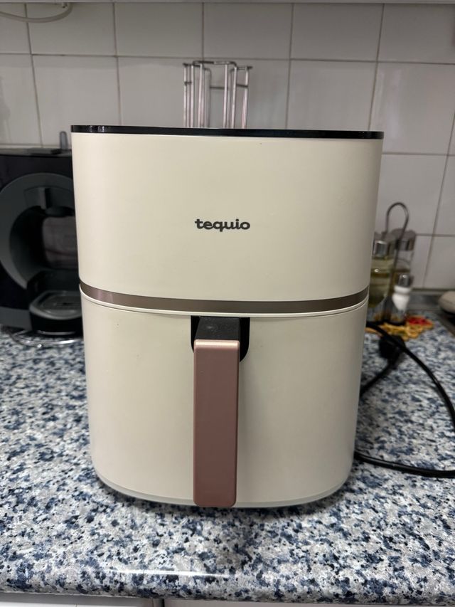 Detalles del productoFreidora de aire de la marca Tequio, con un diseño moderno y elegante en color crema.