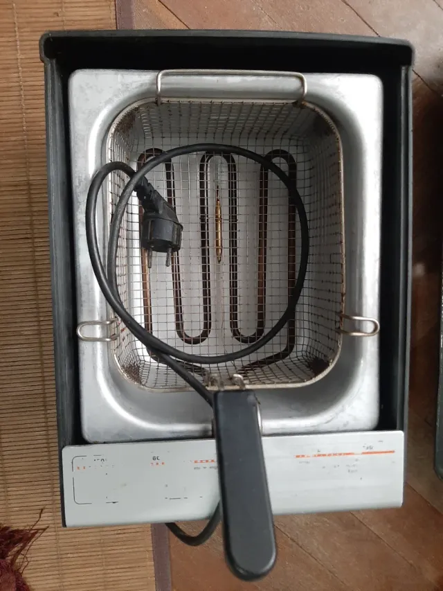Freidora eléctrica con cesta. - Exterior de metal. - Asa negra para la cesta.