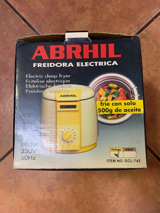 Freidora eléctrica de la marca Abrhil, ideal para preparar tus comidas favoritas. - Potencia: 900W - Voltaje: 230V - Frecuencia: 50Hz - Color: Amarillo y gris