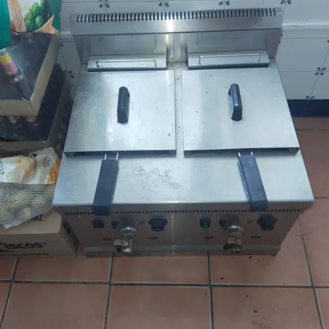 Detalles del productoFreidora industrial de acero inoxidable con dos cubas.