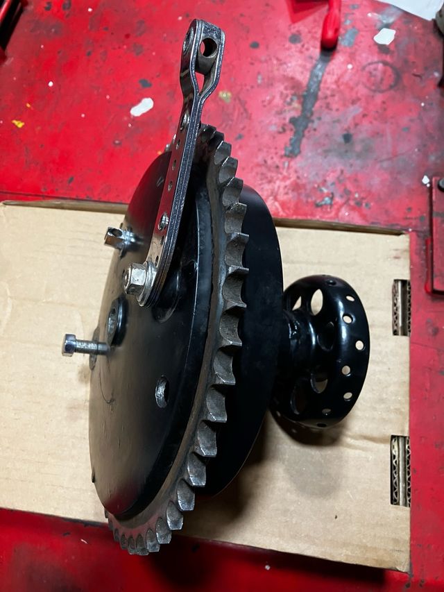 De Harley Davidson Ironhead, buje , tambor , plato porta zapatas , corona , palanca de freno cromada , con tornillería completa