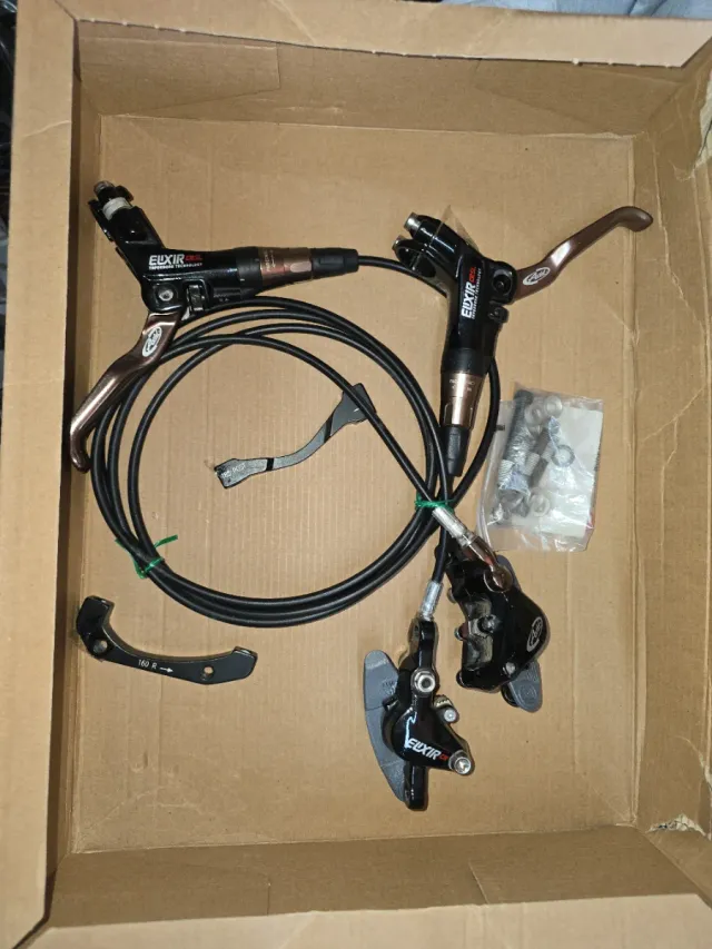 Juego de frenos de disco Avid Elixir. - Manetas de freno. - Pinzas de freno. - Latiguillos. - Adaptador de montaje 160 R. Se regalan 2 discos en buen estado