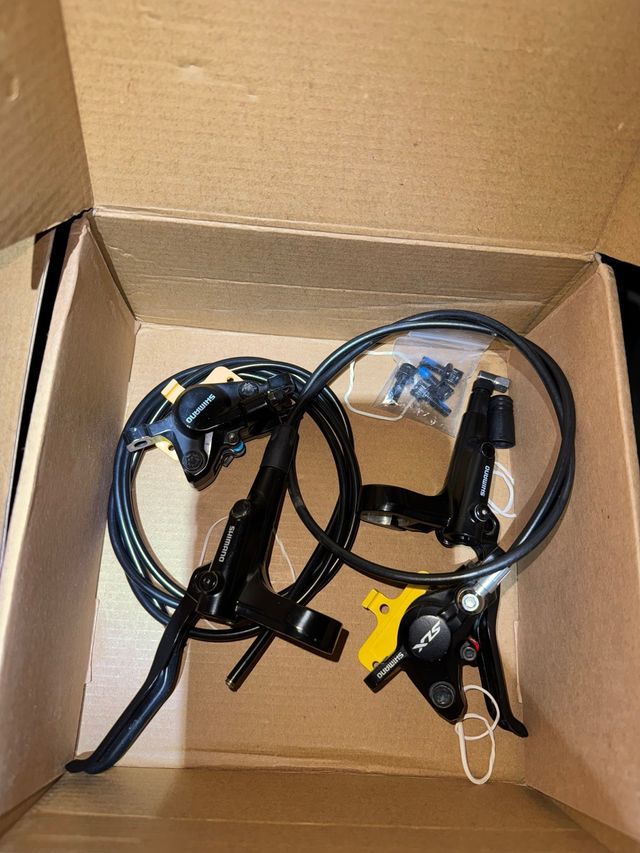 Set de frenos hidráulicos Shimano para bicicleta montaña. - Incluye manetas y pinzas. - Latiguillos nuevos - Incluye tornillería.
