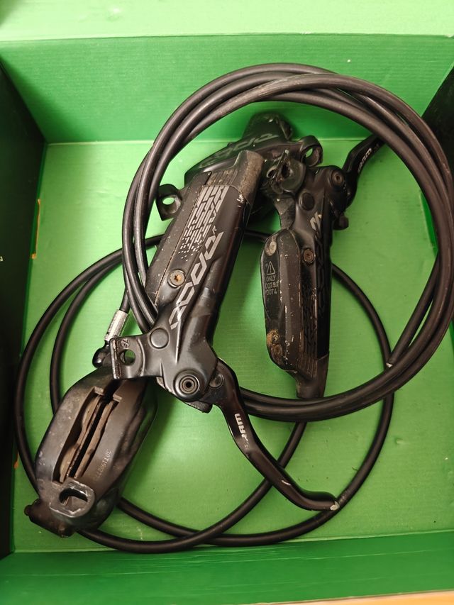 Detalles del productoFrenos de disco SRAM Code R para bicicleta de montaña. Comprados en 2023, están en muy buen estado. La maneta derecha le falta la pieza para regular la distancia de la maneta y le compré el recambio con la maneta nueva y no lo llegué a montar. Ambos frenos los incluyo con pastillas. Las delanteras son galfer. Solamente las pastillas galfer costaron 20.